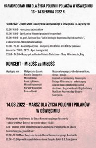 STRONA GŁÓWNA / AKTUALNOŚCI / HARMONOGRAM DNI DLA ŻYCIA POLAKÓW I POLONII W OŚWIĘCIMIU 13 I 14 SIERPNIA 2022 R.